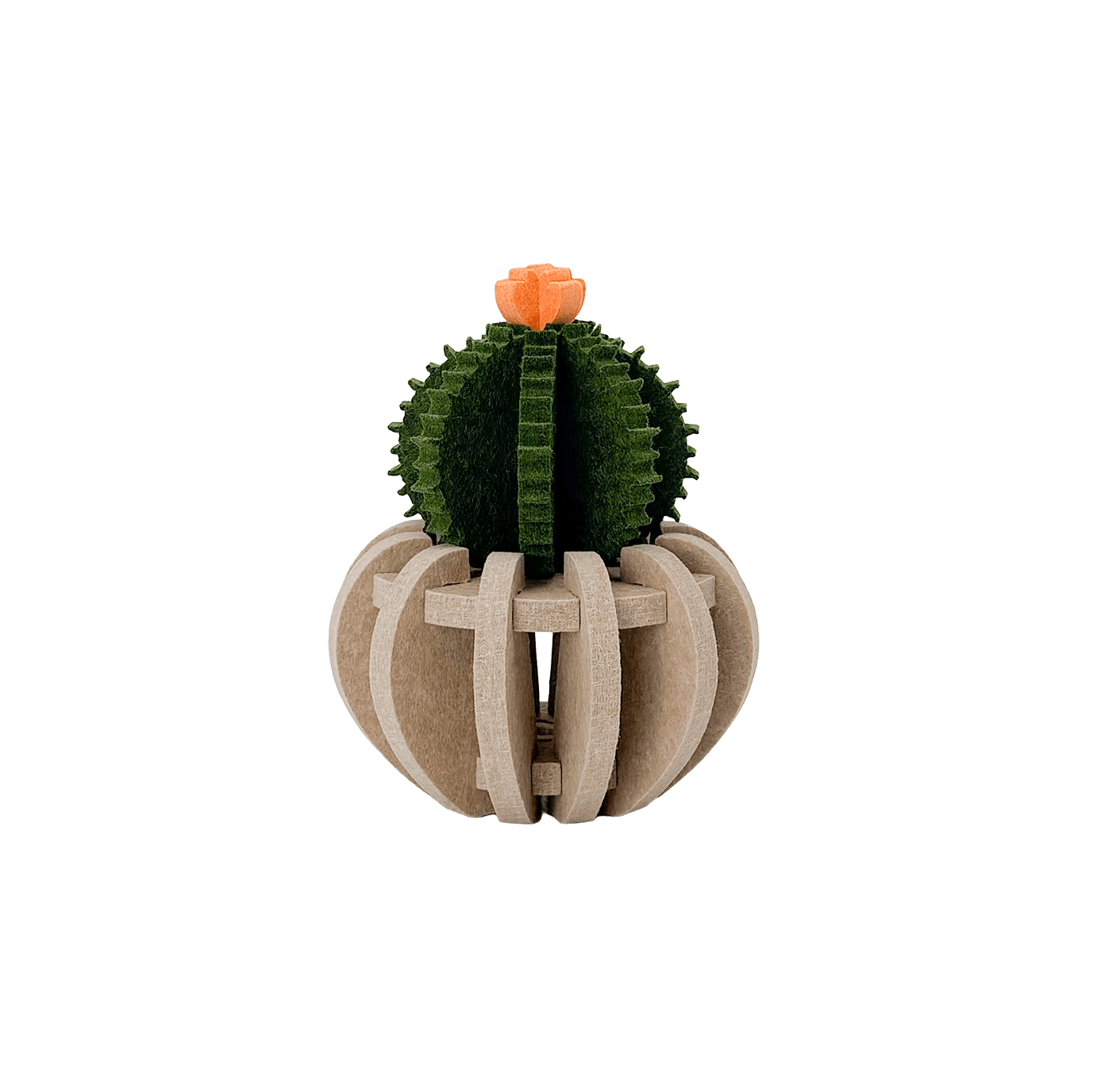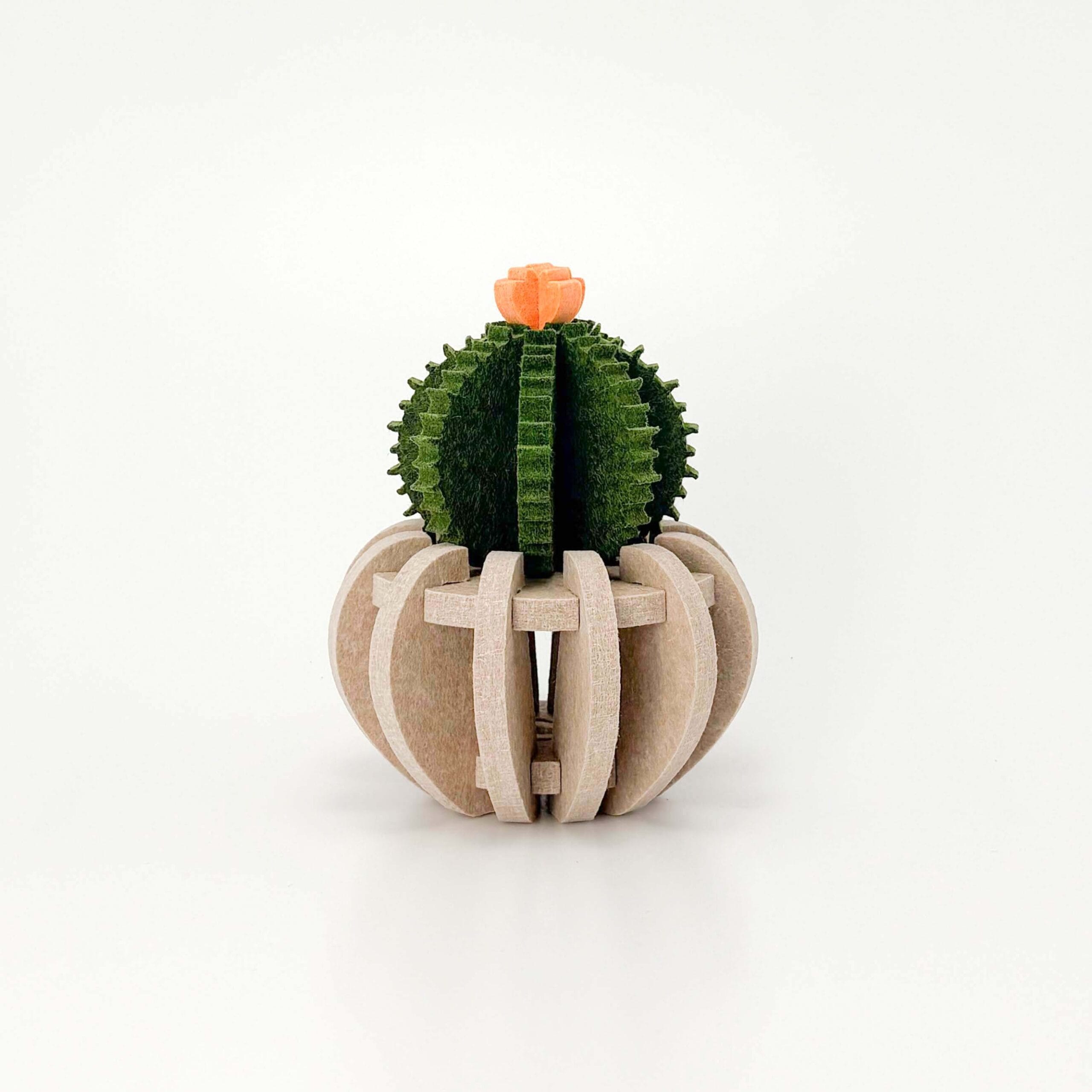 De Bol Cactus heeft een compacte, ronde vorm die perfect aansluit bij de bolle beige pot. De groene kleur van de cactus wordt speels geaccentueerd door de oranje bloem bovenop, terwijl het gerecyclede PET-vilt zorgt voor een duurzame en akoestisch prettige toevoeging aan je interieur.