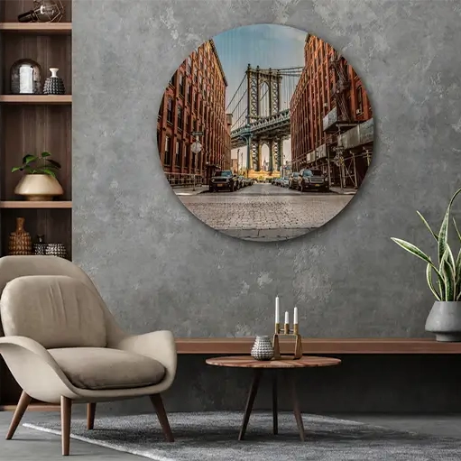 Een industriële muurcirkel die een stukje New York City in je woonkamer brengt. Dit stijlvolle beeld geeft een unieke touch aan elke ruimte.