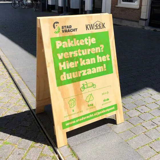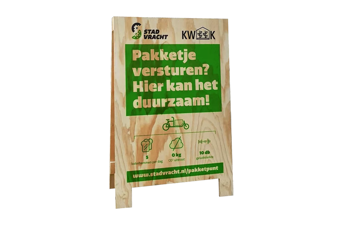 Ieder stoepbord wordt duurzaam gemaakt met FSC gekeurd hout. Dit betekent dat het gebruikte hout op een milieuvriendelijke manier uit het bos is geoogst. Daarnaast houden we rekening met een milieuvriendelijk printproces. Met een duurzame UV-printer wordt de bedrukking geleidelijk aangebracht. Tegelijkertijd droogt de printer de UV-inkt direct op. Er komen geen schadelijke oplosmiddelen aan te pas. Perfect als je een milieuvriendelijke indruk wil achterlaten bij de doelgroep. Optioneel  behandelen we het houten stoepbord met een transparante buitenbeits. Dit biedt een duurzame bescherming waarbij de houtstructuur nog mooi zichtbaar blijft. Ons advies is om het stoepbord bij regen binnen te zetten en jaarlijks te beitsen, zodat je de levensduur van de reclamedrager verlengt. Er wordt geen garantie verleend op eventuele schimmelvorming door weersinvloeden.