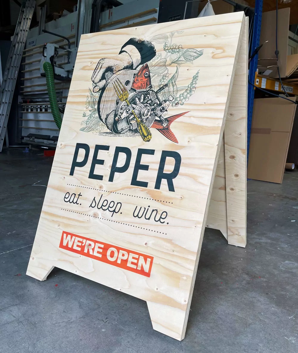 Zoek je een houten stoepbord, maar wil je niet te diep in de buidel tasten? Ons budget stoepbord biedt de uitkomst. Deze aandachtstrekker is te verkrijgen in 15mm dik Underlayment, verbonden met een stevige borgketting. Deze underlayment platen bestaan uit verschillende op elkaar verlijmende houtlagen. Hierdoor is het materiaal sterk en heel goed te bewerken. Ideaal om het ontwerp zo gedetailleerd mogelijk te bedrukken. Laat de huisstijl, logo en unieke boodschap printen en trek de aandacht van passanten. Het budget stoepbord is voor ieder bedrijf die extra wil opvallen, van een horecagelegenheid tot een kledingwinkel.