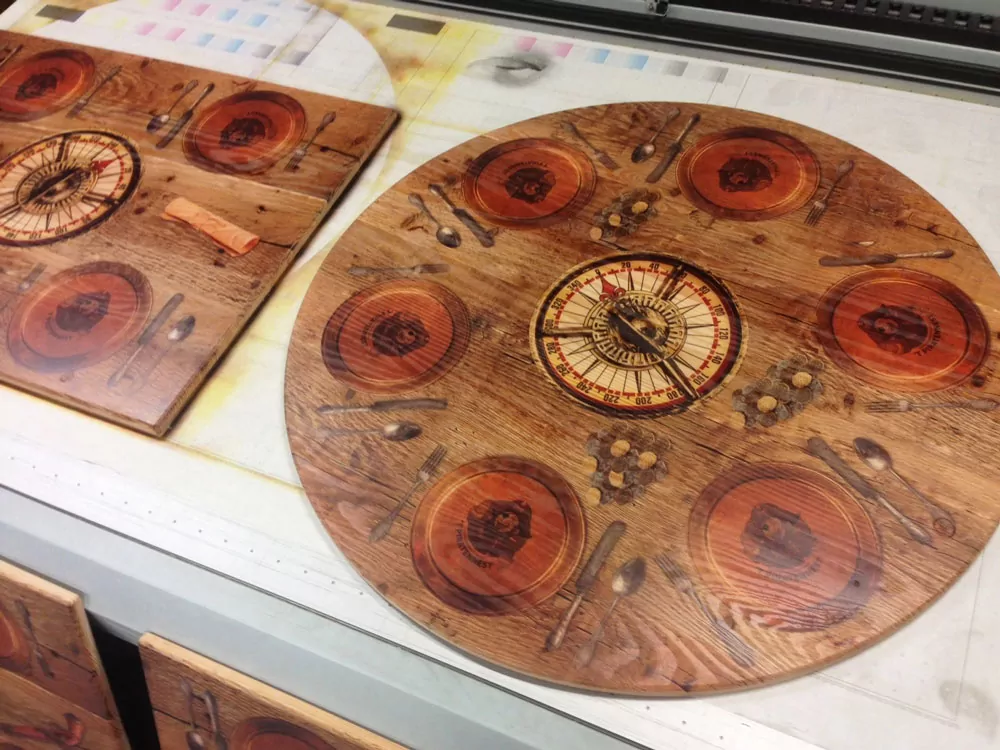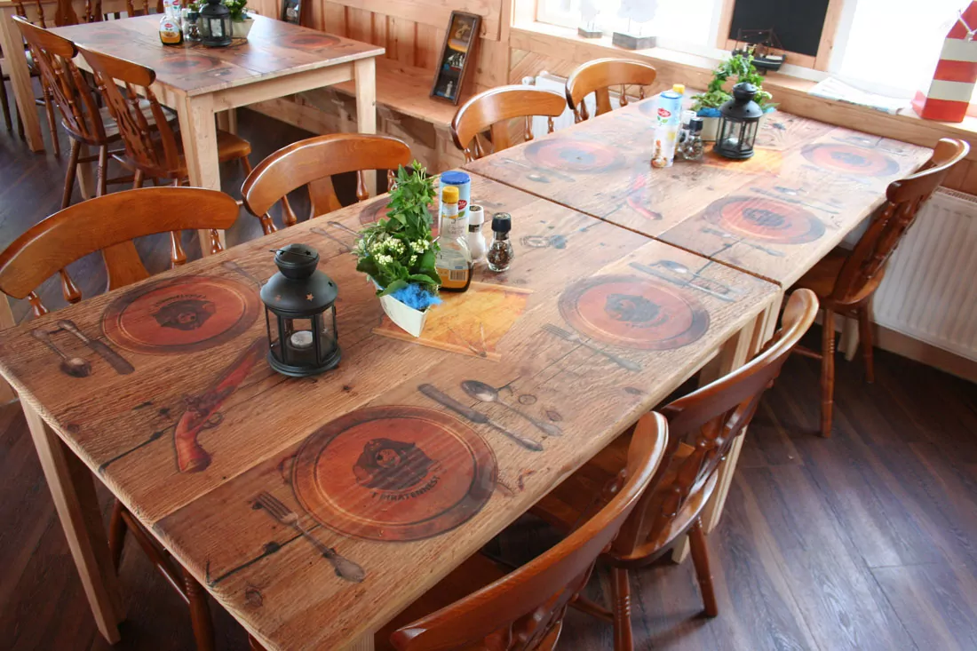 Heb je een mooi tafelblad en wil je het blad nieuw leven inroepen? Laat de tafel bedrukken met een sfeervolle en mooie print, zodat je het tafelblad nieuw leven inblaast. Bij Woodprint is het mogelijk om je huidige tafelblad te brengen, zodat wij de unieke print verzorgen. Geprinte tafels zorgen voor een unieke sfeerbeleving. Laat je logo, huisstijl of een sfeerbeeld op de tafel bedrukken. Het is zelfs mogelijk om een menukaart op het houten blad te printen. Vervolgens beschermen we de tafel met een vochtbestendige laag, zodat omgestoten vloeistof de tafel niet permanent aantast.