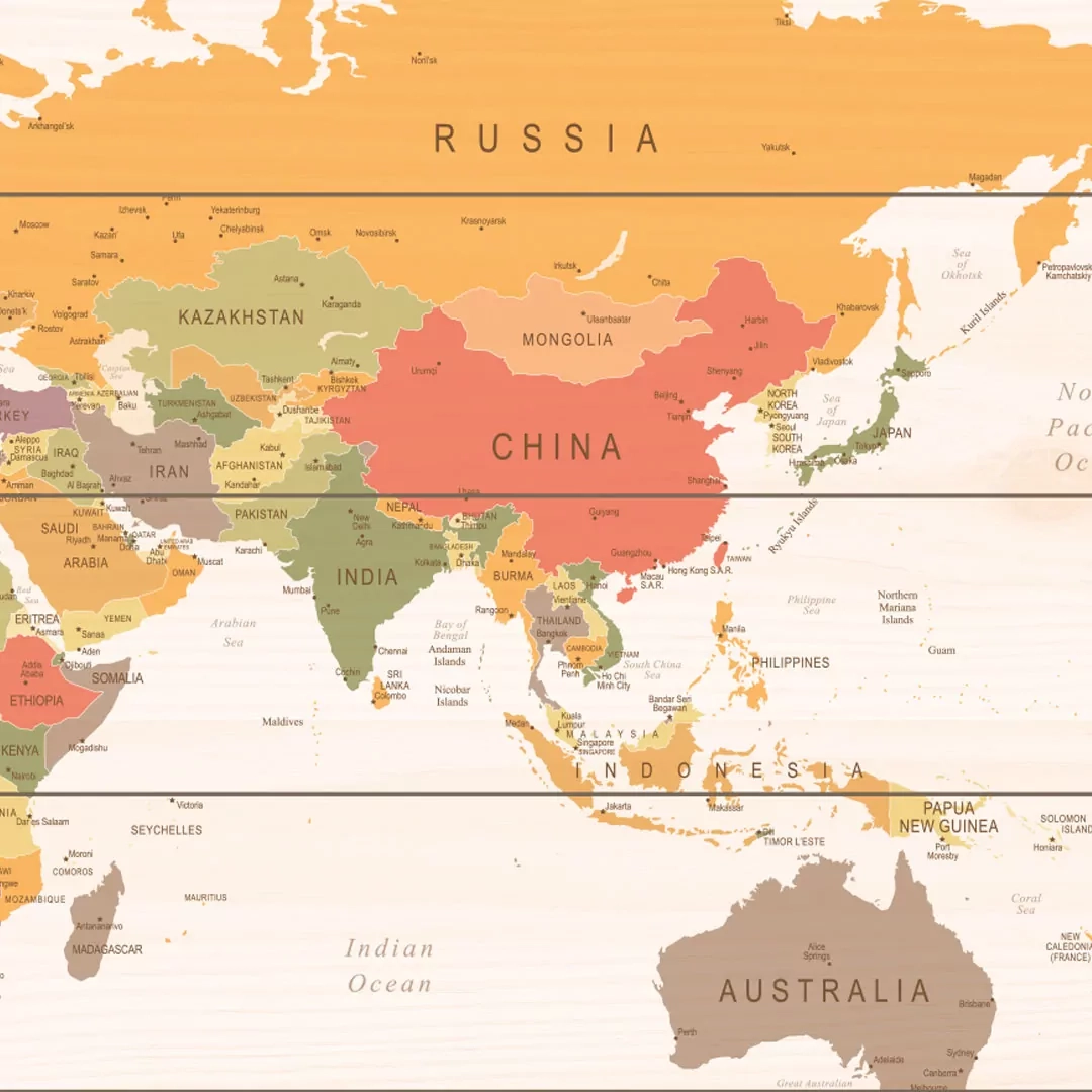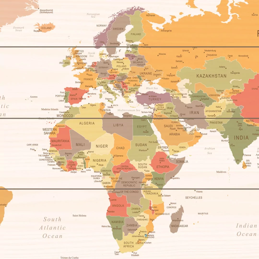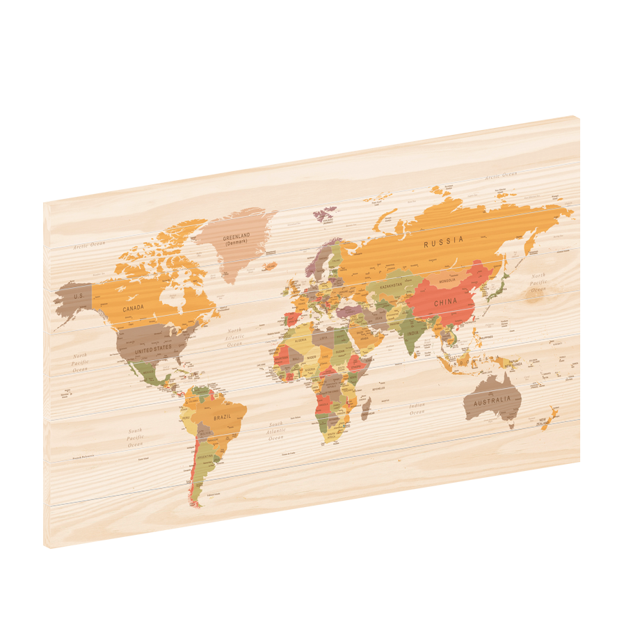 Deze houten wereldkaart is neutraal en toch kleurrijk. De gedempte kleuren overheersen niet waardoor ze vooral in interieurs met warme tinten goed uit komen.
