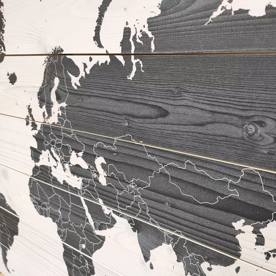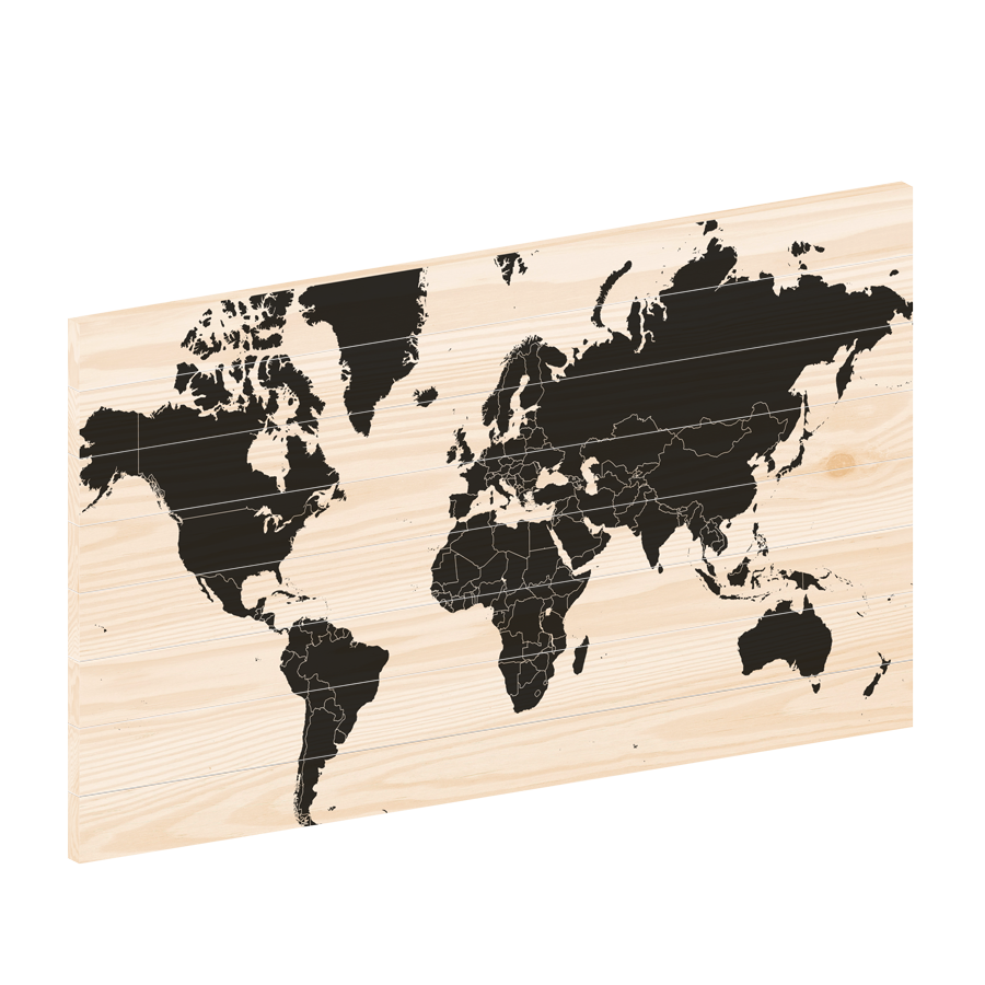 Deze houten wereldkaart is sober, strak en natuurlijk. Doordat het hout geen extra whitewash krijgt blijft de houtstructuur mooi zichtbaar en contrasterend met de zwarte continenten.
