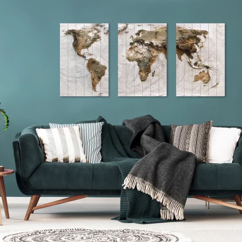 De Wereldkaart Drieluik Earth komt volledig tot zijn recht op een grote, open wand. Door het grote formaat en de 100 gratis meegeleverde pushpins of vlaggetjes kun je een volledig eigen en speelse draai aan je houten wereldkaart geven.