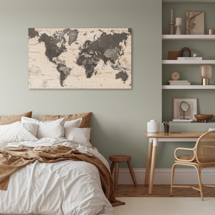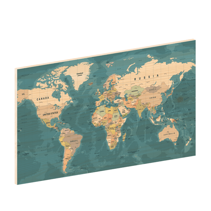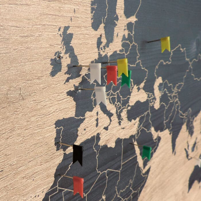 De Wereldkaart Drieluik Earth komt volledig tot zijn recht op een grote, open wand. Door het grote formaat en de 100 gratis meegeleverde pushpins of vlaggetjes kun je een volledig eigen en speelse draai aan je houten wereldkaart geven.Populierenhout