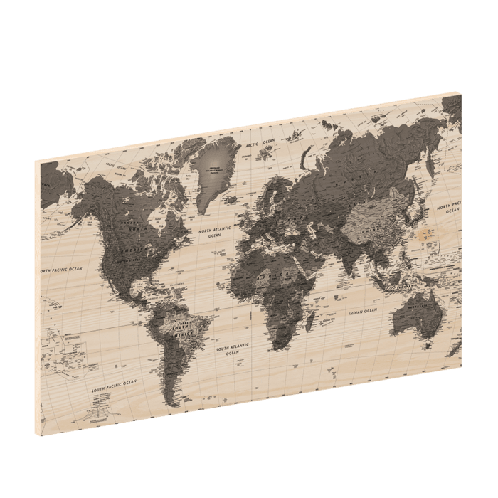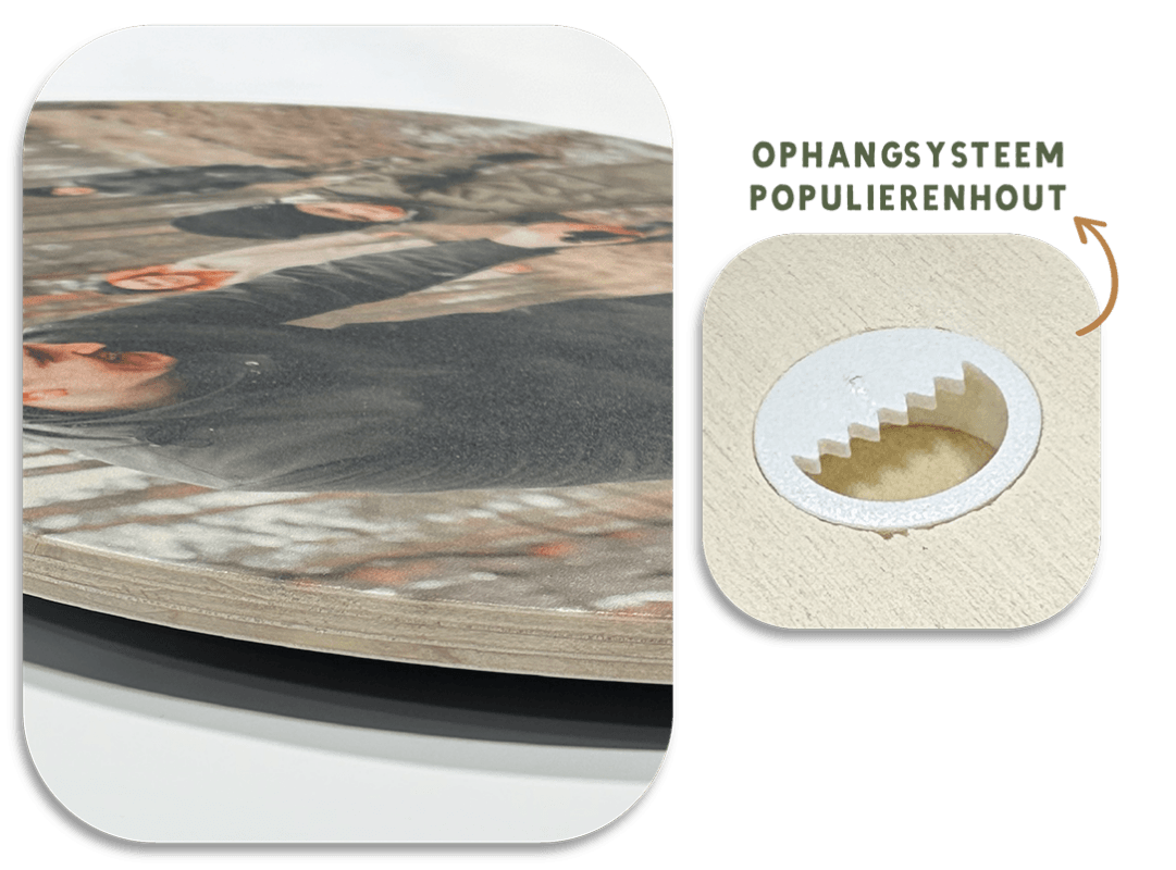 Elke wereldkaart wordt geprint op een duurzame houten plaat die uit meerdere lagen bestaat. De lagen geven de zijkant een natuurlijke uitstraling en zorgen voor een sterke, lichte constructie. Omdat de foto uit één geheel bestaat, zie je geen naden of groeven in het beeld. Het hout is vrijwel noestvrij, waardoor alle aandacht naar je foto gaat. De subtiele houtstructuur en heldere kleuren zorgen samen voor een sfeervol en gedetailleerd resultaat.Basis ophangsysteem