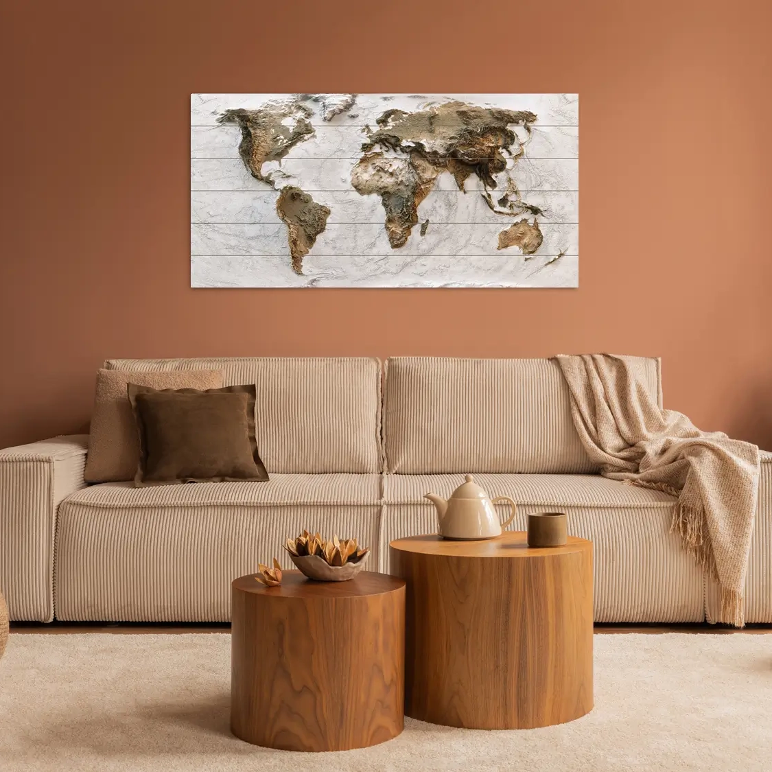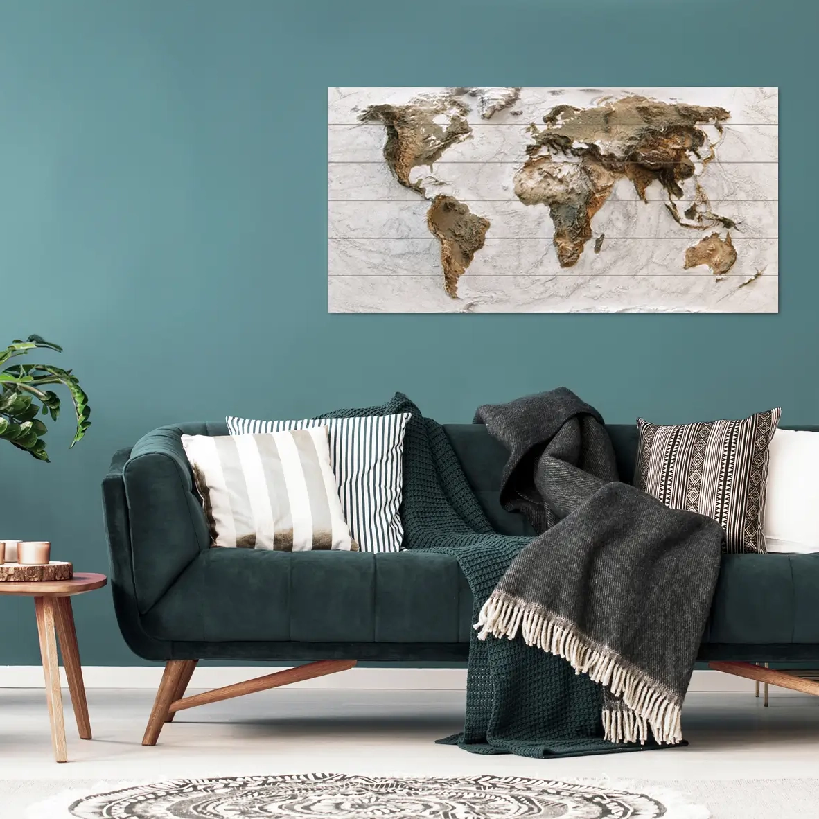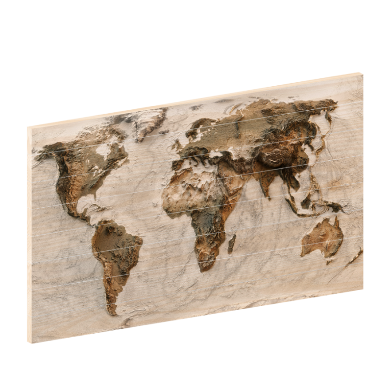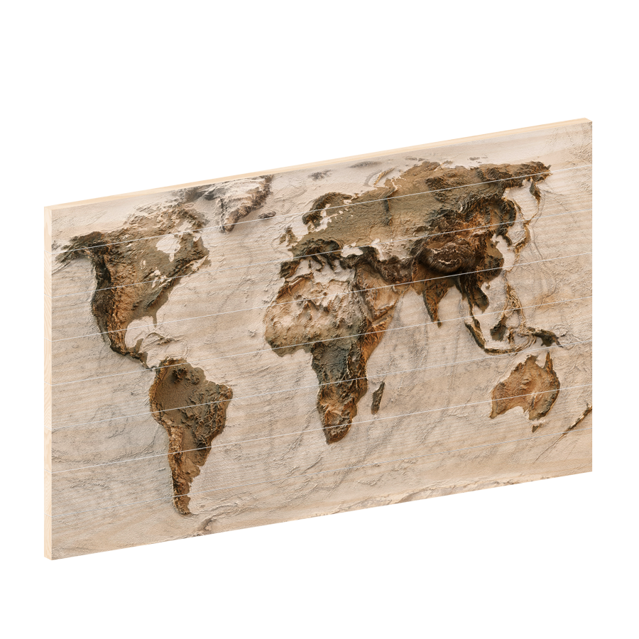 Deze houten wereldkaart lijkt heel bijzonder. De afbeelding is een platte print, maar lijkt alsof deze met structuurverf een prachtig 3D effect gekregen heeft.