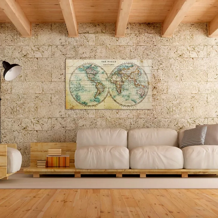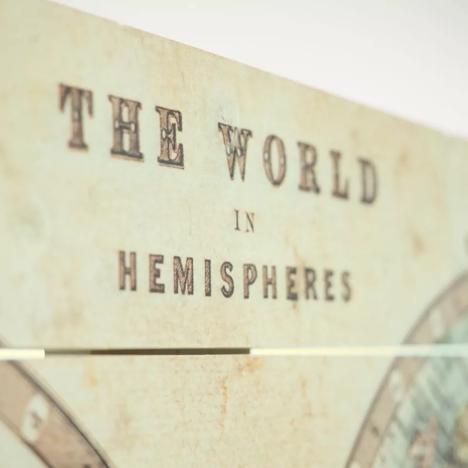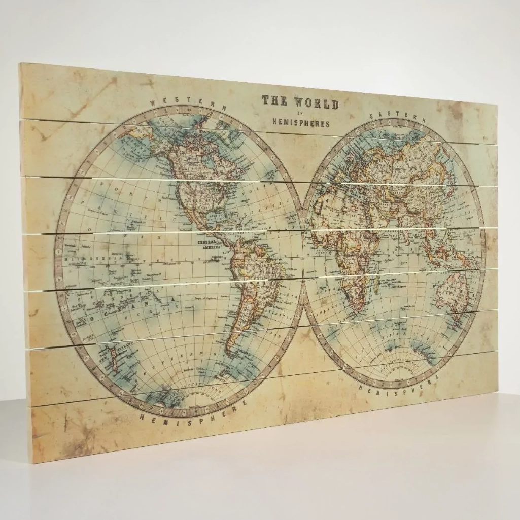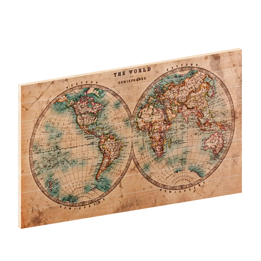 Deze houten wereldkaart, die veel weg heeft van een navigatiekaart uit de oude scheepsvaart, bestaat uit twee halfronden van de wereld. In de linker bol zijn de continenten Noord -en Zuid Amerika te zien. In de rechter bol zie je de overige continenten van de wereld. Dankzij de bijzondere vormgeving is deze wereldkaart een ware eyecatcher.