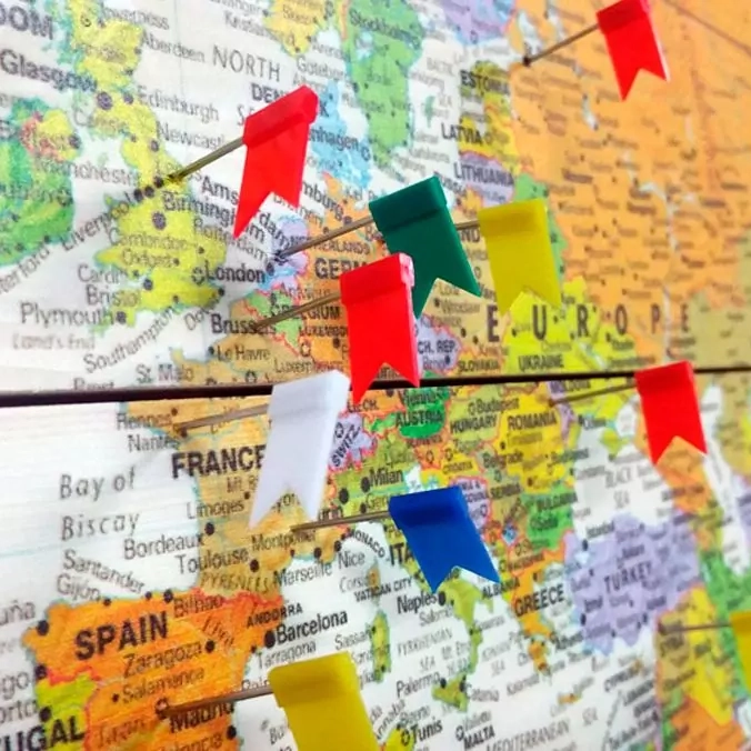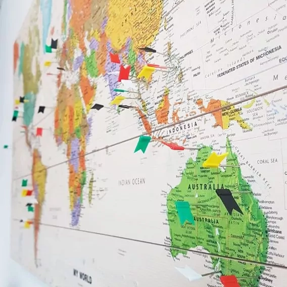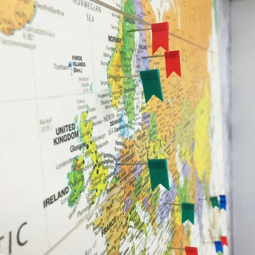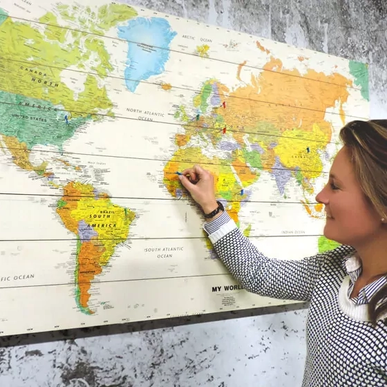 De Wereldkaart Modern herken je direct aan zijn kleurrijke karakter. Ieder land heeft een andere kleur gekregen dan de buurland. Om de landen heen zie je rode grenslijnen, zodat je direct jouw bestemming vindt. De gehele kaart is gedetailleerd gevuld met namen van steden, dorpen, gebergten en oceanen. Heb je een geweldige wereldreis gemaakt of een onvergetelijke stedentrip in Europa? Met de 100 gratis prikkers laat je zien waar je allemaal bent geweest en nog dolgraag heen wilt. Ga op zoek naar jouw bezochte bestemmingen, sla de prikker in de kaart en denk terug aan je mooie reisavonturen.