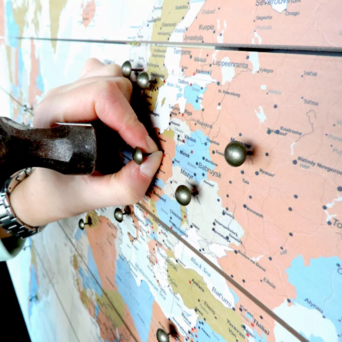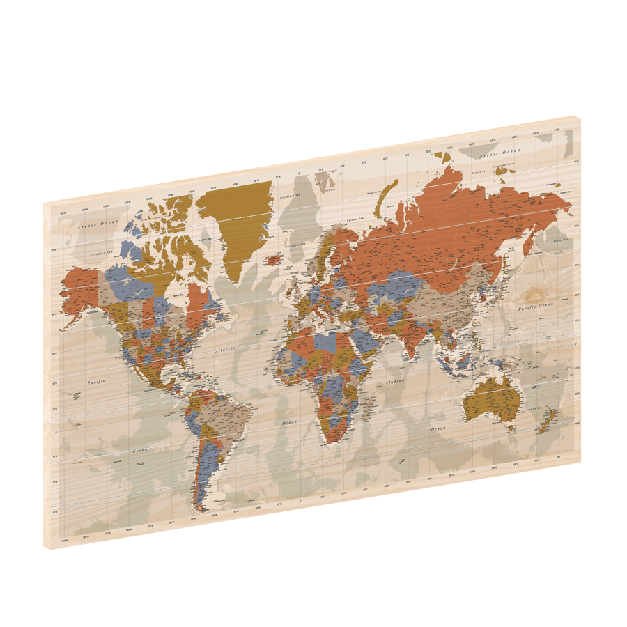 wereldkaart op hout nog levendiger te maken, is de hele kaart gevuld met namen van steden, dorpen, gebergten en oceanen. Hierdoor kun je snel en eenvoudig jouw bezochte bestemming vinden. Met de 100 gratis prikkers laat je zien waar je allemaal bent geweest en nog dolgraag heen wilt.