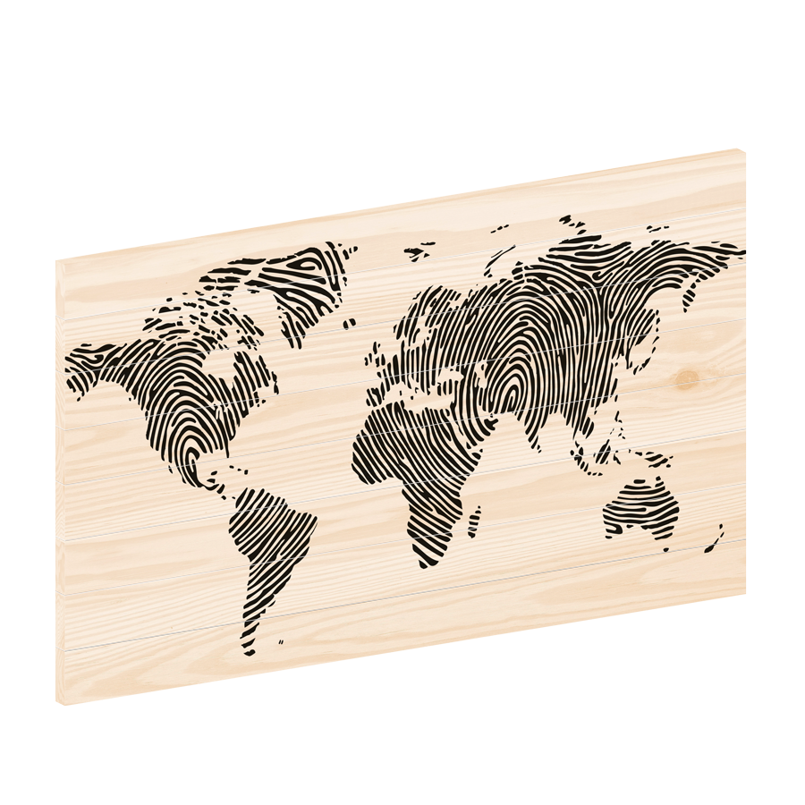 houten wereldkaart heeft een blanco achtergrond. Wanneer deze op hout geprint wordt, zal de natuurlijke houtstructuur behouden blijven en krijg je een prachtig subtiel eindresultaat.