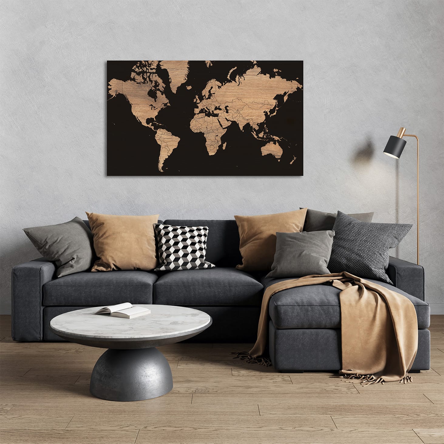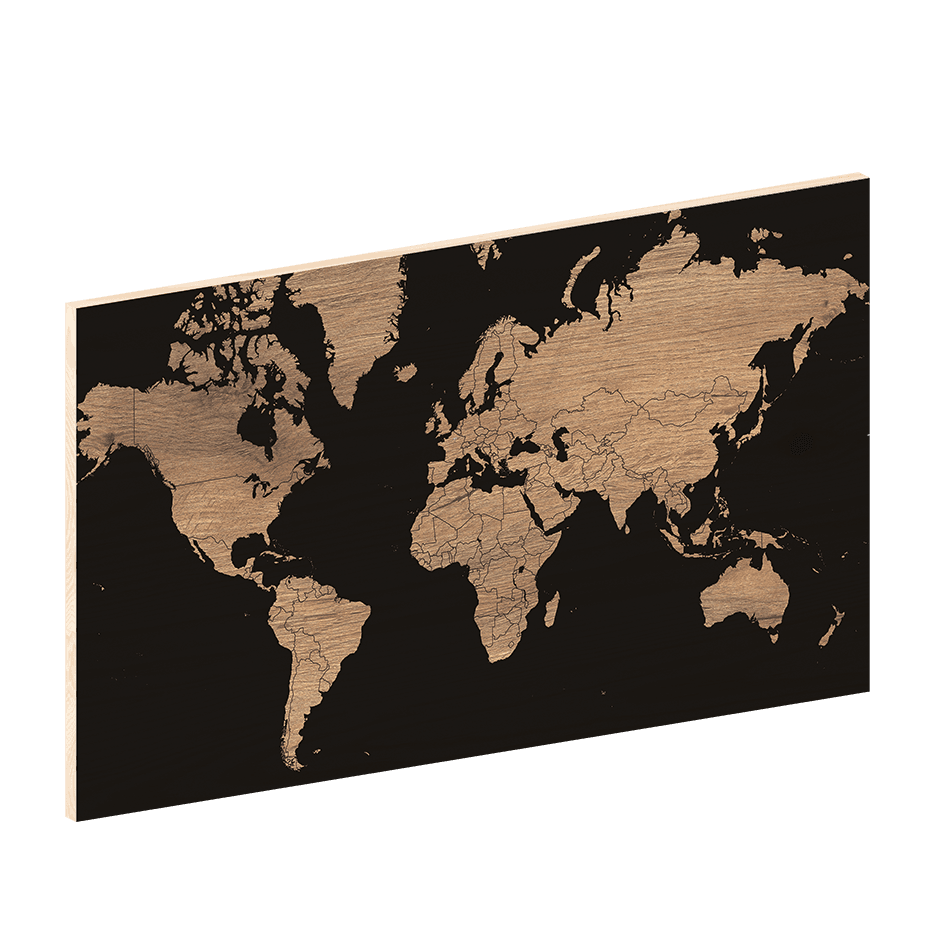 De Wereldkaart Wood combineert warm populierenhout met een diepe zwarte achtergrond, waardoor de continenten krachtig naar voren komen. De natuurlijke houtnerf geeft elke kaart een unieke uitstraling en zorgt voor een stoer, maar toch verfijnd geheel aan de muur.Populierenhout